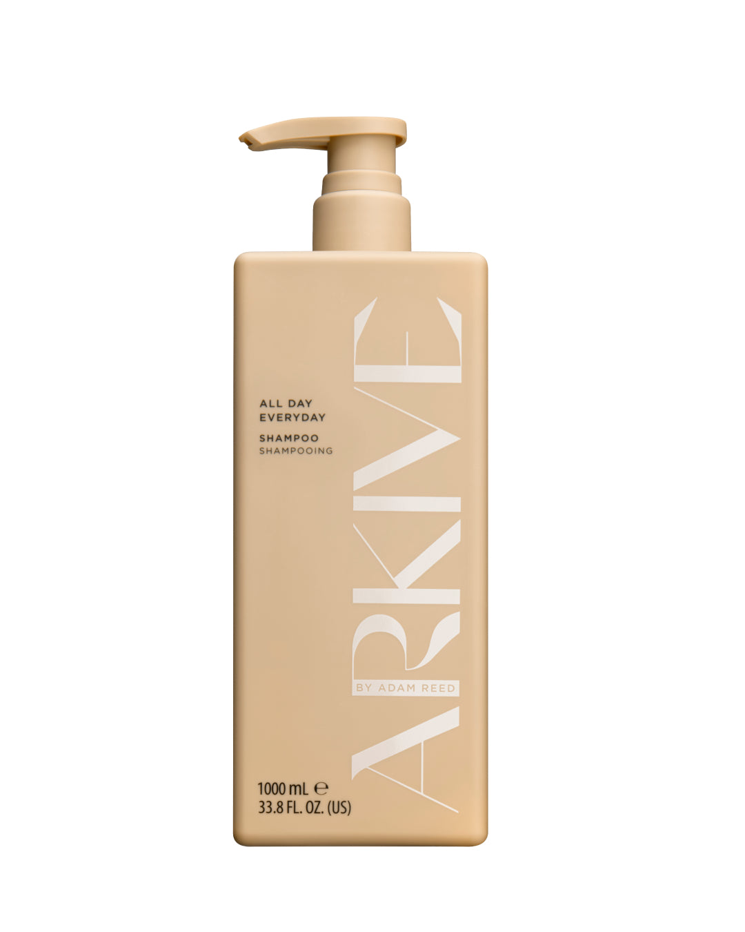 A tattooed hand holding a bottle of Arkive's all day everyday shampoo
