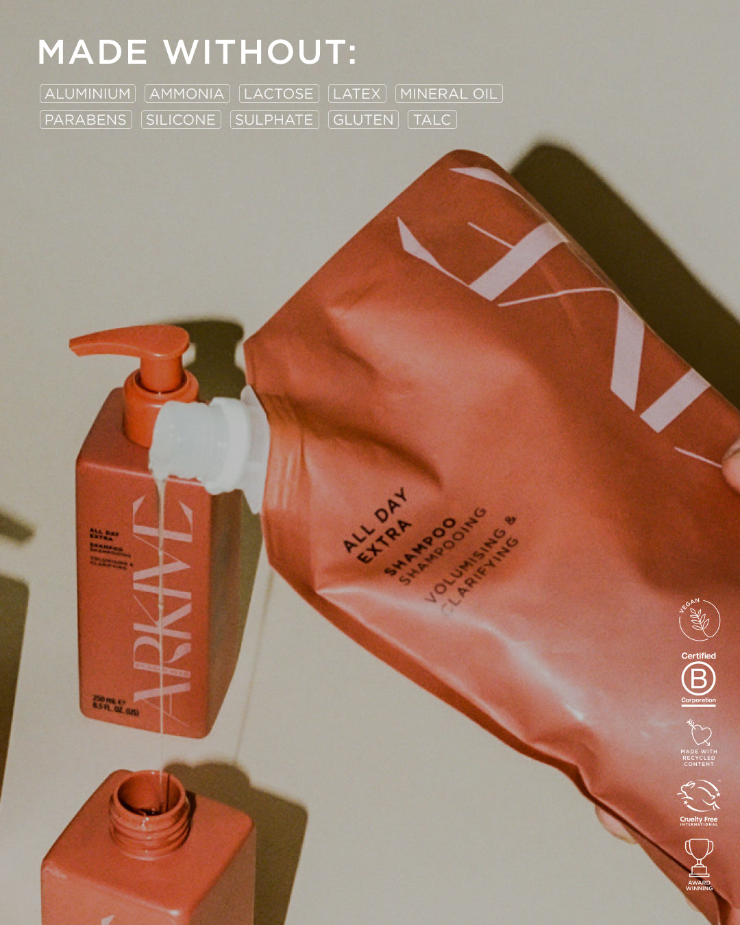 "For those looking for a little extra clarity, ARKIVE’S brand new All Day Extra Shampoo brings weightless volume with an ultra clear finish for the hair and heads."