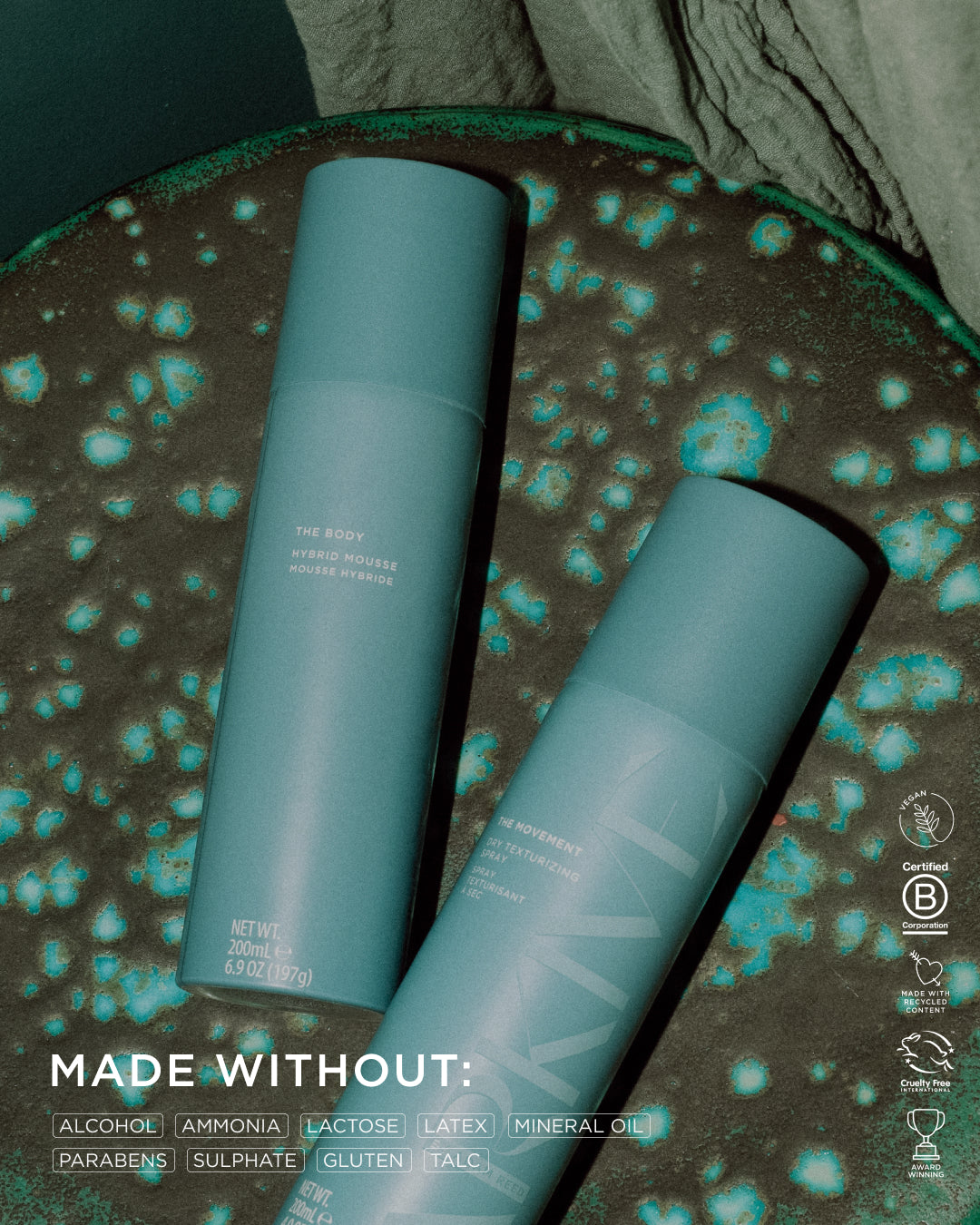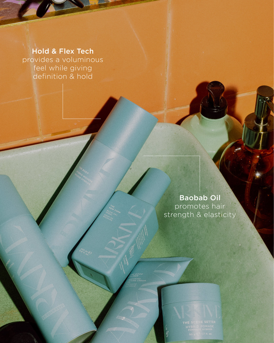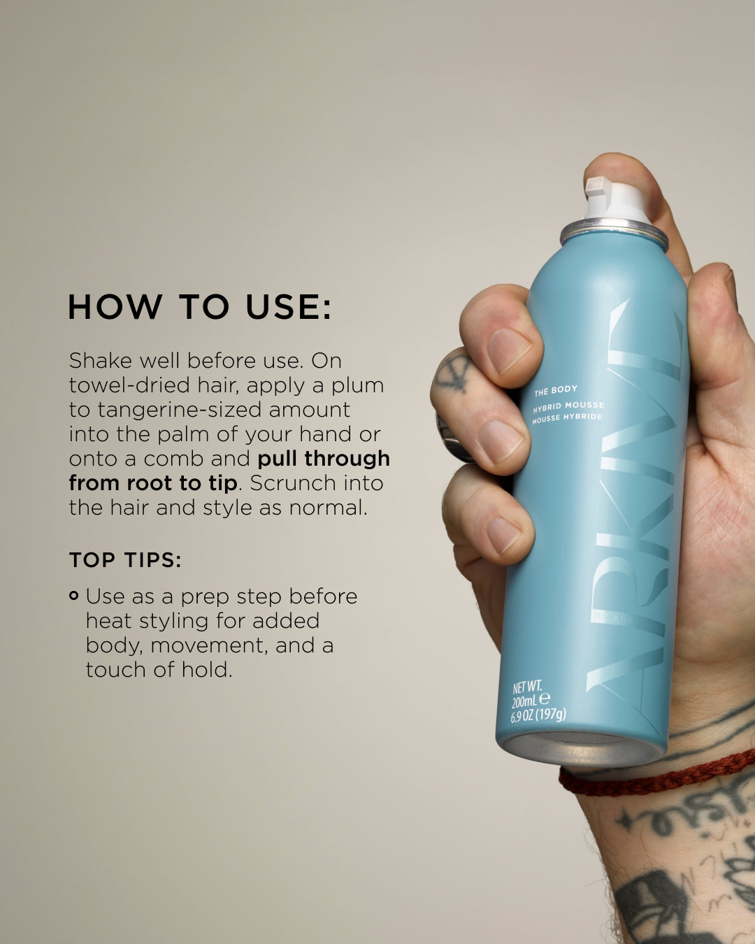 “Quench your hair’s thirst and deliver full-bodied, texturised style with ARKIVE’s moisturising, creamy and lightweight The Body Hybrid Mousse.”