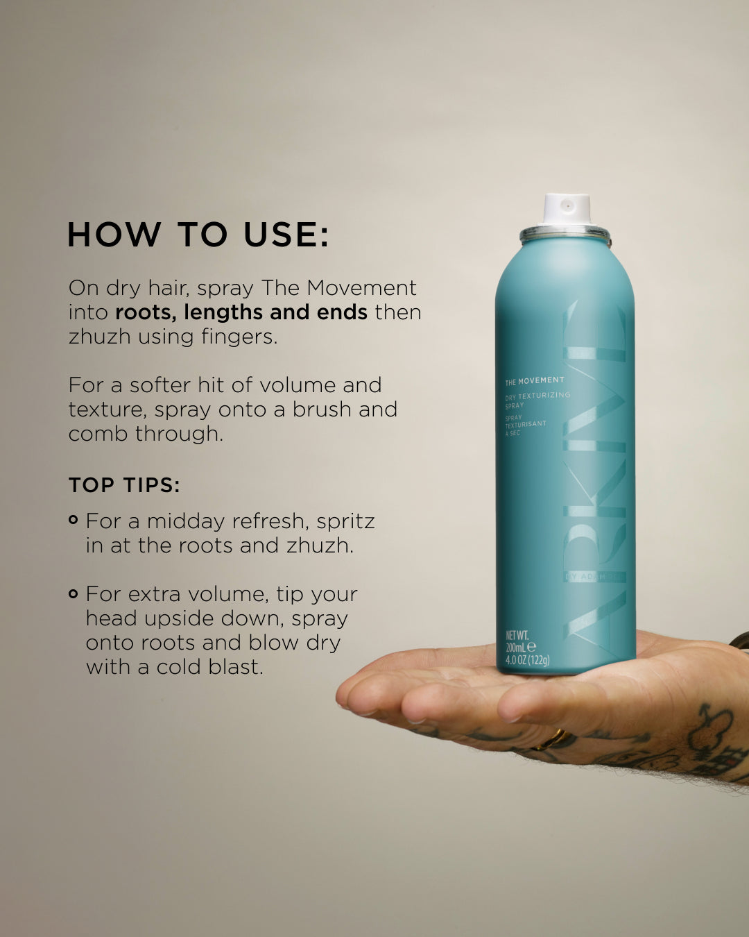 “Give your hair effortless volume and movement on-the-go, or to add dimension to your style with ARKIVE’s volumizing hero The Movement Dry Texturizing Spray.”