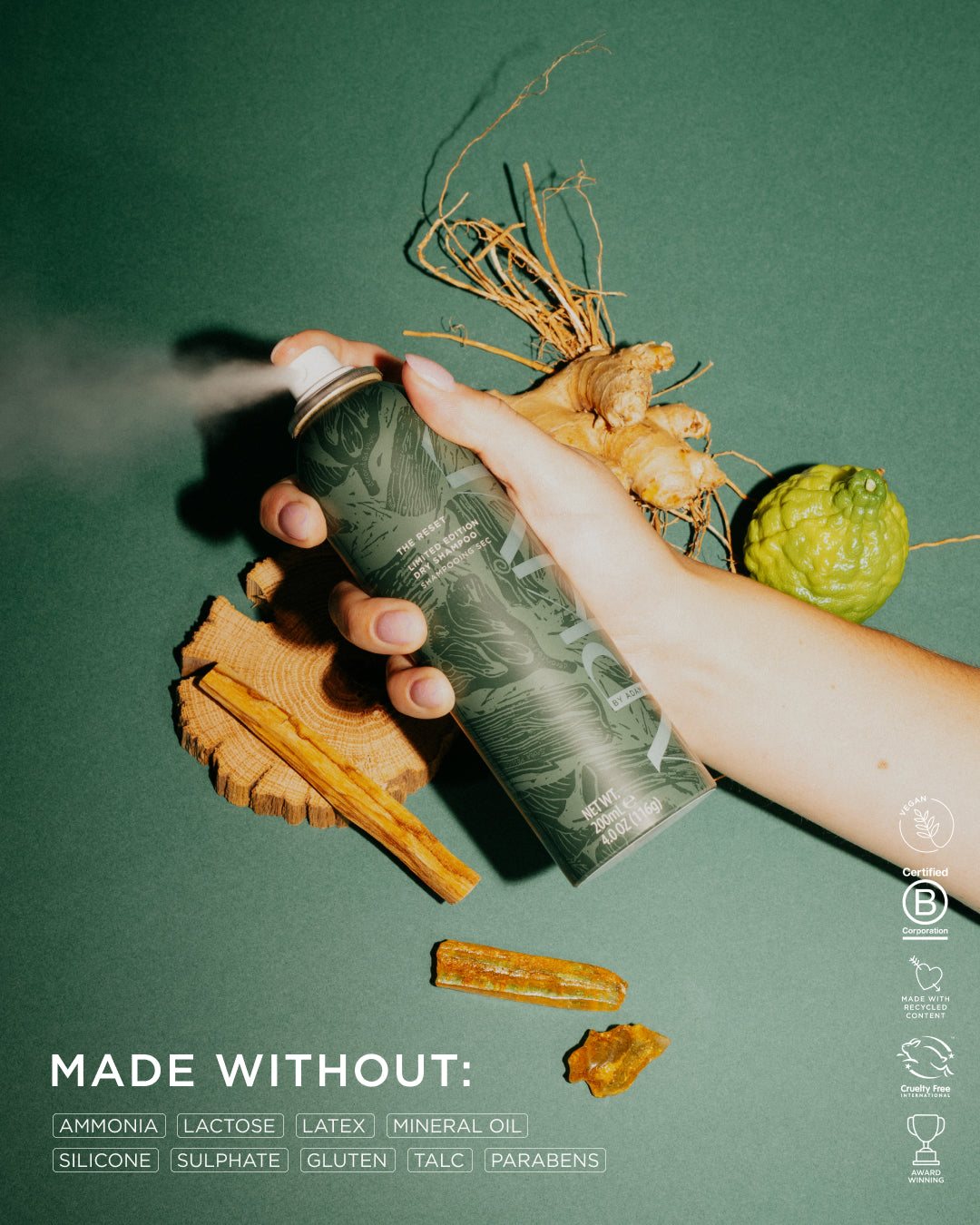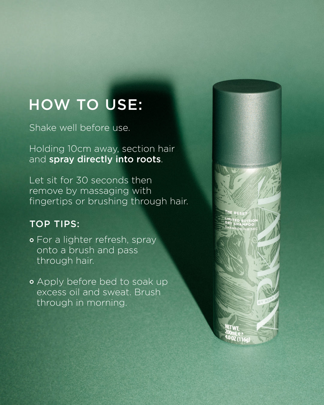 Our much loved The Reset Dry Shampoo has become a cult, must-have staple in Headcare routines around the globe. Now available in a limited-edition scent, Decorated Woods. The lush English woodland is infused into the fragrance, drawing on Adam’s favourite space to reground and refresh. Lively Ginger and Bergamot unfold into a heart of Saffron and Palo Santo with a base of Amber. Cedarwood and Frankincense to invigorate the sense, whilst Patchouli, Vetiver and Moss add a balanced richness.